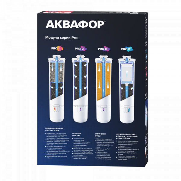 • Комбинация трех сменных модулей Pro 1, Pro Н и Pro B обеспечивает четырехступенчатую очистку, одновременное умягчение и ультрафильтрацию водопроводной воды. Ресурс картриджей ECO H Pro больше аналогичных систем с функцией умягчения и составляет 8 000 литров.