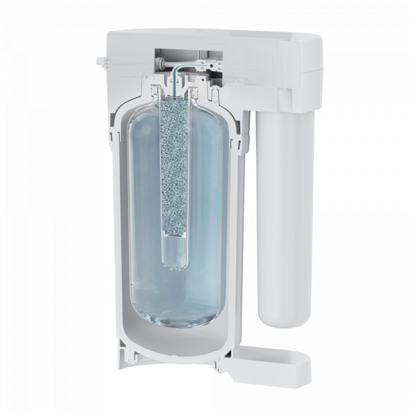 Минерализатор в модели DWM-80SN встроен непосредственно в пятилитровый накопительный бак. Благодаря такому решению вода обогащается магнием интенсивнее и дольше, чем в системах с внешним модулем. Для семьи из трех человек, фильтрующей воду ежедневно, ресурса встроенного минерализатора хватит на пять лет. Конструкция бака не предусматривает его замену.